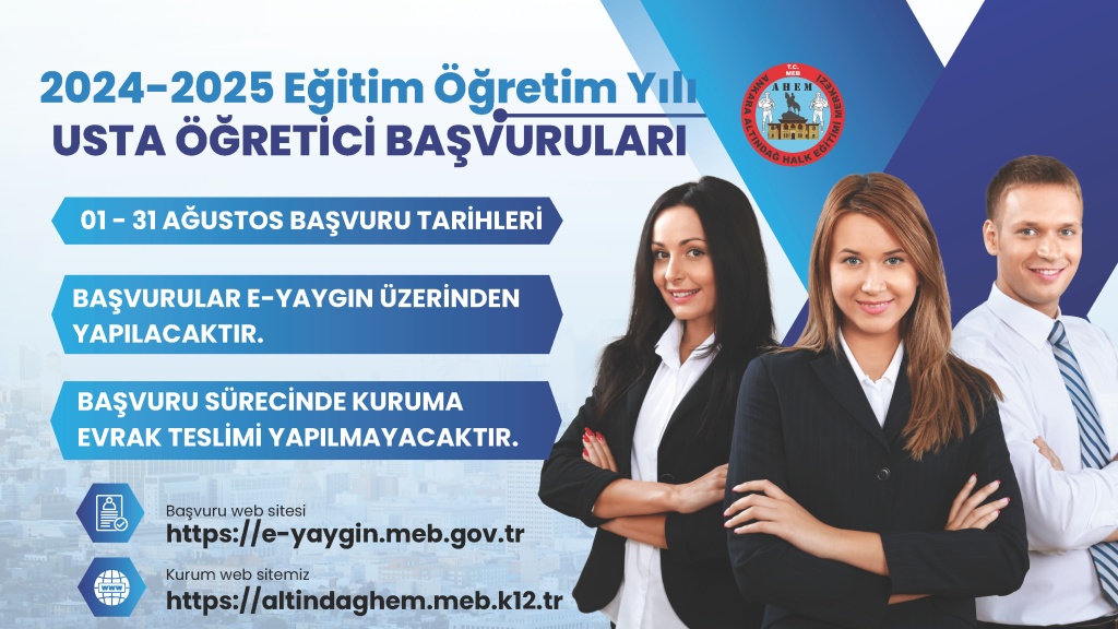 2024-2025 Eğitim Öğretim Yılı Müdürlüğümüz bünyesinde Ücretli Usta Öğretici olarak görev alacakların başvuruları ve evrak yüklemeleri 01-31 Ağustos 2024 tarihleri arasında e-devlet [e-yaygın] sistemi üzerinden online yapılacaktır. Süreç hakkında web sitemizdeki açıklamalara dikkat etmeniz menfaatinize olacaktır.