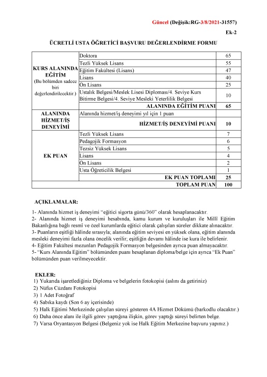"Ücretli Usta Öğretici Başvuru Değerlendirme Ek-2 Formunda" Mezuniyet durumlarına göre puan verilmektedir. Örnek: Eğitim Fakültesi Lisans Mezunları 47 puan, Lisans mezunu 40 puan, Formasyonu olan lisans mezununa ilave 6 puan (Toplam 46 puan) gibi puan değerleri belirlenmiştir. "Mezuniyet Belgesi" olarak yüklenecek belge, Modüler Kurslar Programında ilgili kursun Eğitici Nitelikleri bölümünde istenen mezuniyet seviyesine ait Diploma sureti olmalıdır.